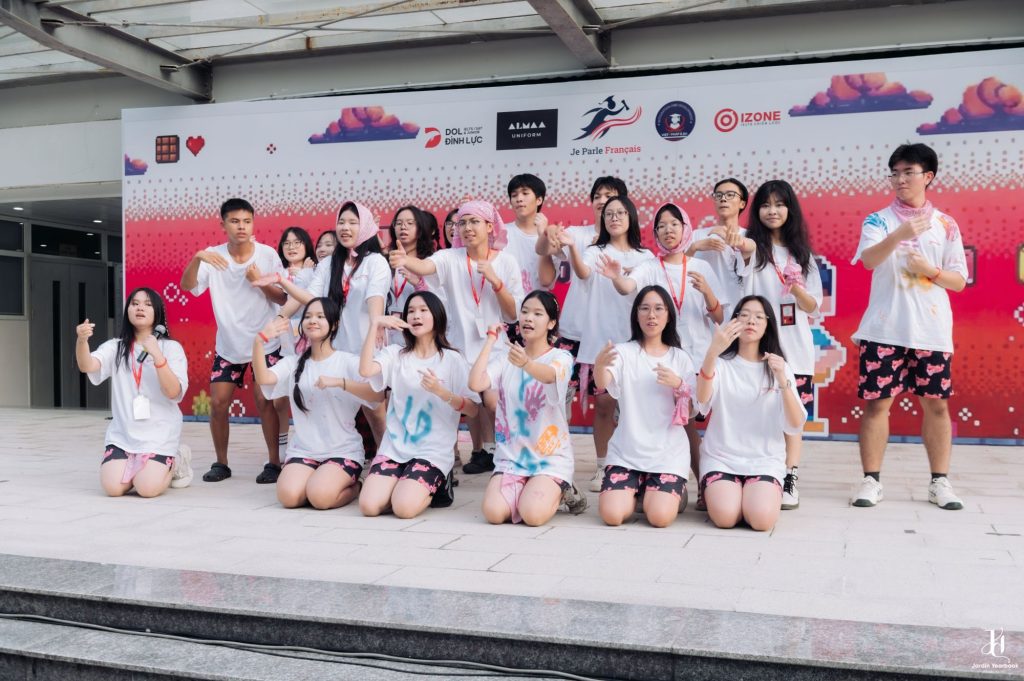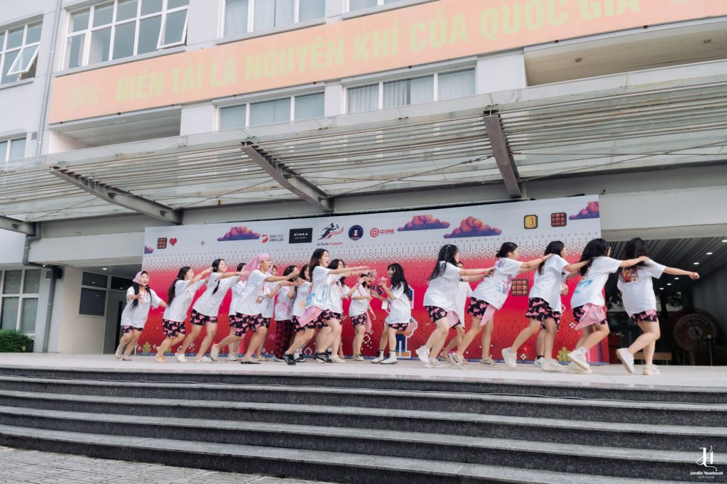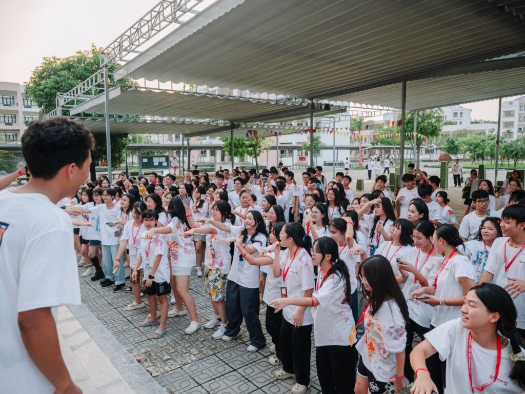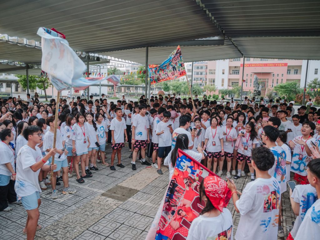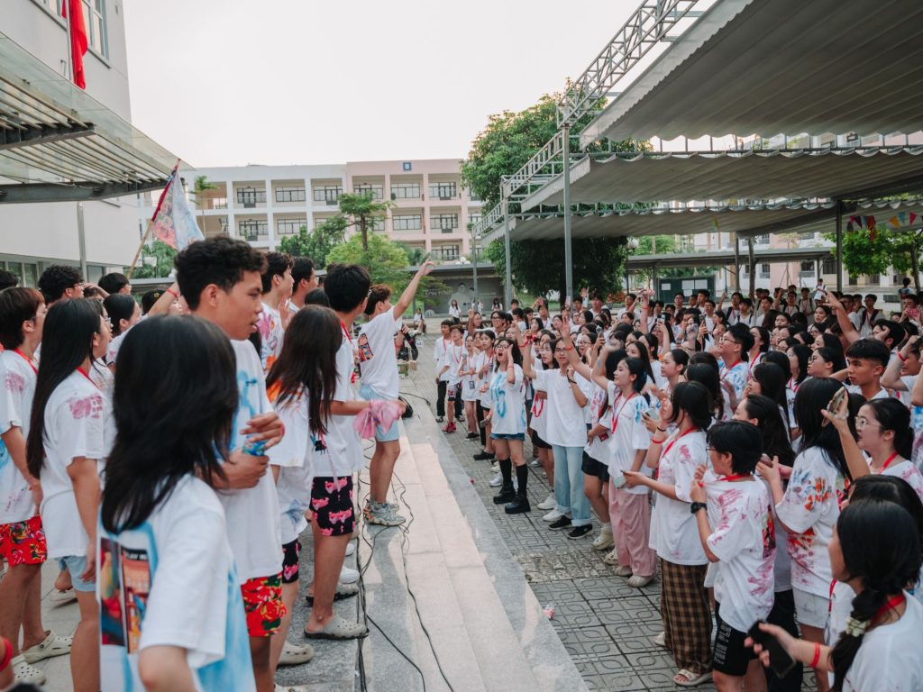 Chưa để sức nóng hạ nhiệt, phần cheer battle kế đến đã đốt cháy toàn bộ. Cả sân trường như cùng hoà vào một nhịp đập, một thanh âm. Tiếng hô vang, tiếng cười đùa, những cái “thumbs down” trêu vui, tất cả hoà quyện thành một bản giao hưởng đậm sắc “Huệ”. Thành viên của mỗi đảo đều hoà mình vào bầu không khí nhiệt huyết, khản cả họng vì bài cheer rực cháy.