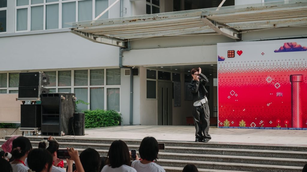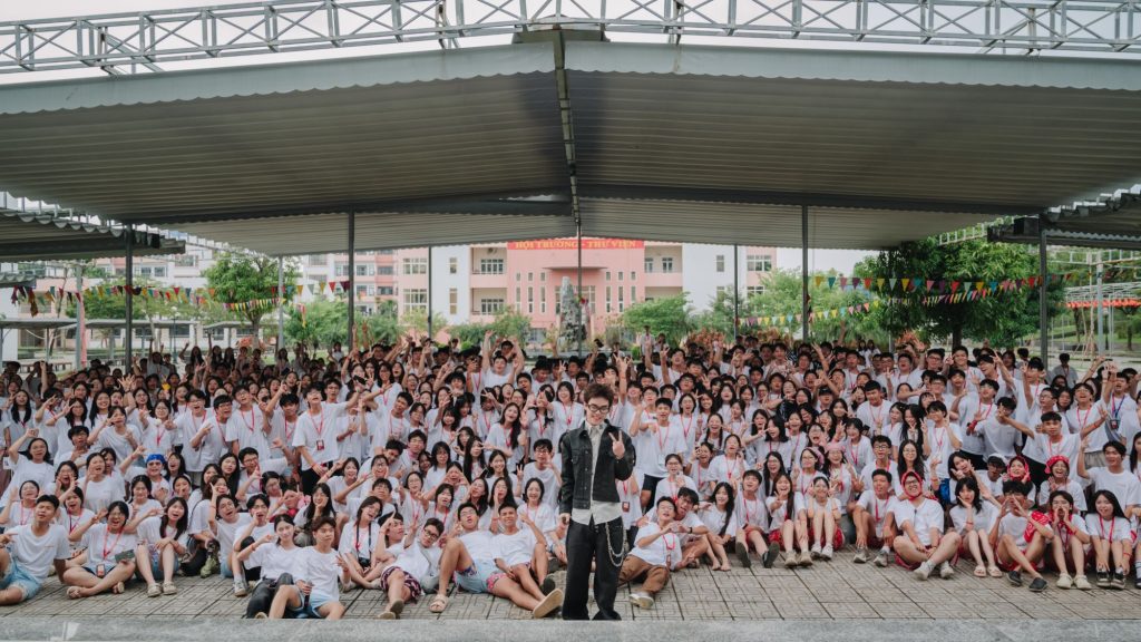 Bức ảnh kỉ niệm giữa rapper Dangrangto và các bạn học sinh trường Chuyên Nguyễn Huệ